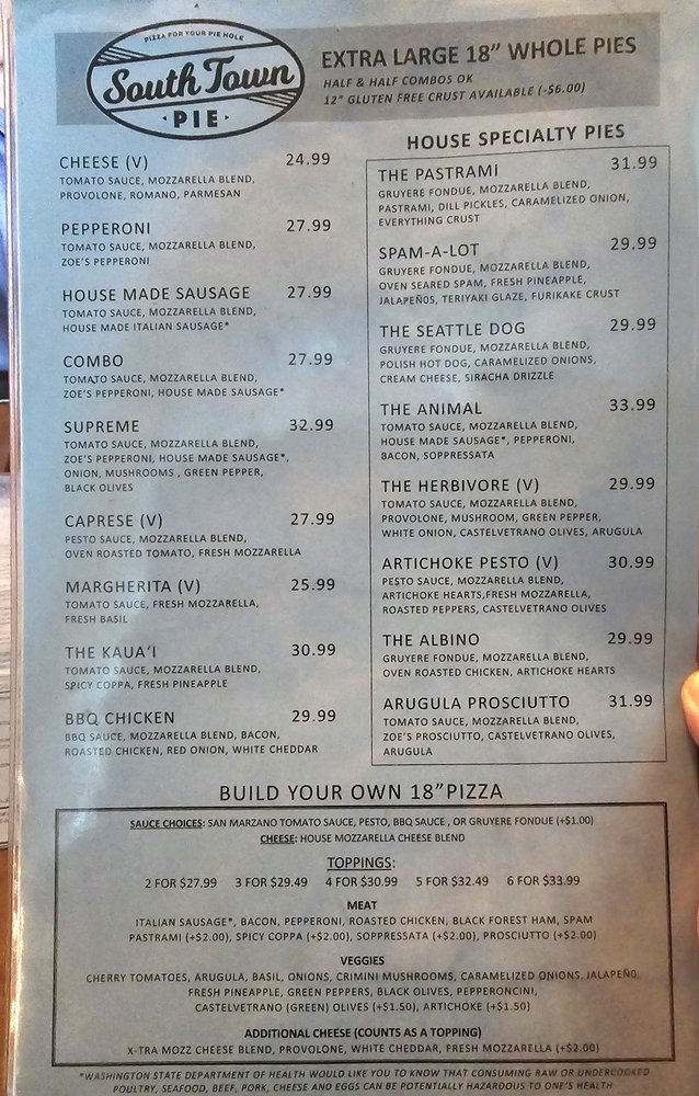 Located in Seattle, South Town Pie offers a vibrant atmosphere where pizza aficionados can gather for a delightful experience. Known for its excellent range of pizzas, the menu features customizable 16-inch whole pies, allowing diners to choose from various toppings, including vegan and vegetarian options. The Half N Half pie is a highlight, letting you enjoy two flavors in one pizza.